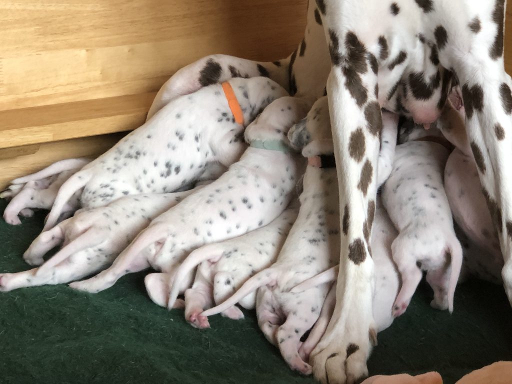 Auch wenn die Welpen die meiste Zeit noch geschlafen, kommt so langsam Bewegung rein. An der Milchbar bei Mia wird es auch schon eng, da die Zwerge ganz schön gewachsen sind.