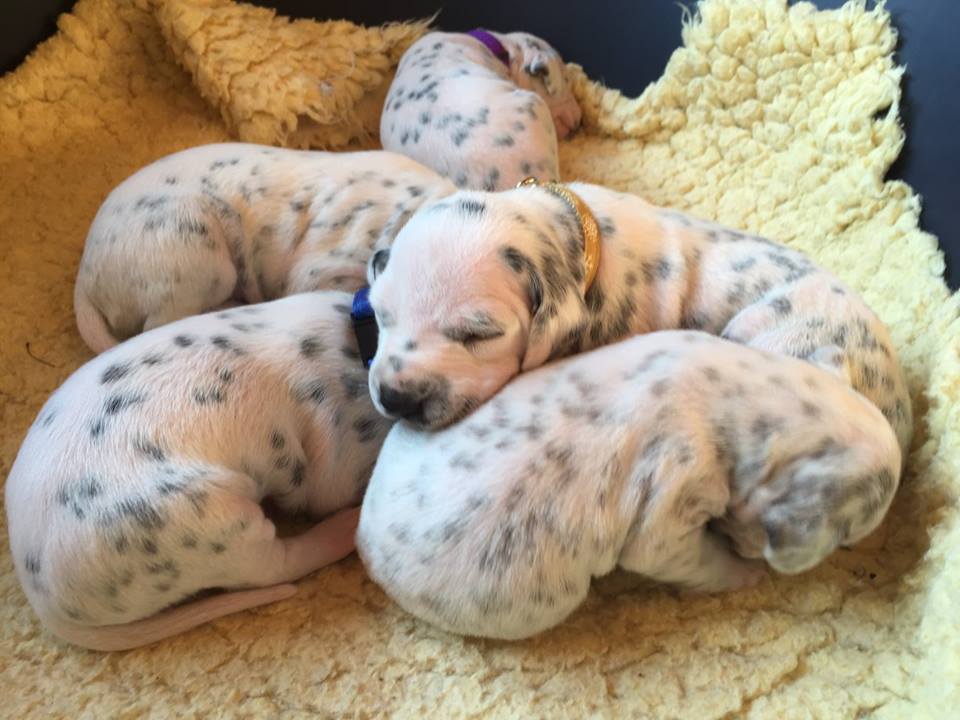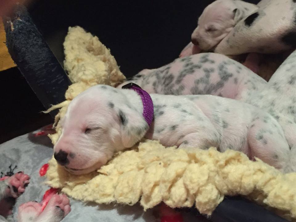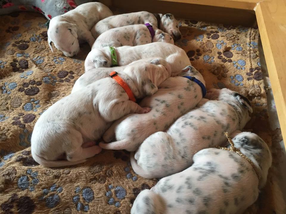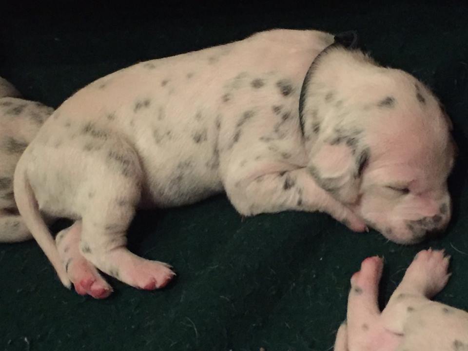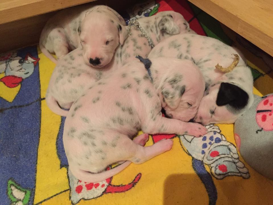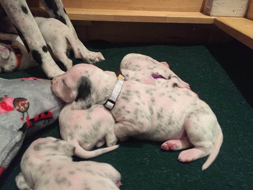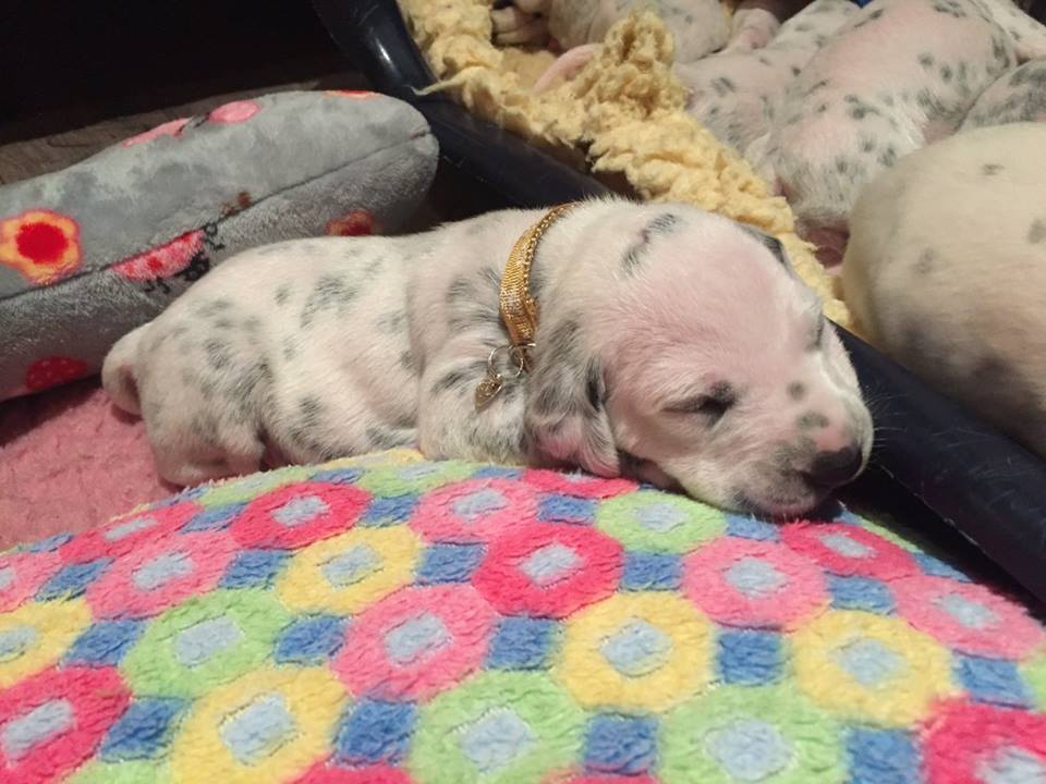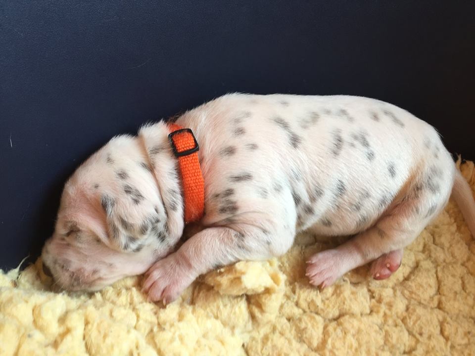 Anfang der zweiten Woche hatten alle ihr Geburtsgewicht verdoppelt. So langsam öffnen sich die Augen und auch die Farbe der Tupfen wird kräftiger. Die Kleinen beginnen nicht nur an Mamas Zitzen, sondern auch an ihren Geschwistern zu nuckeln 🙂 Die Halsbändchen haben wir auch ausgetauscht in etwas Größere.