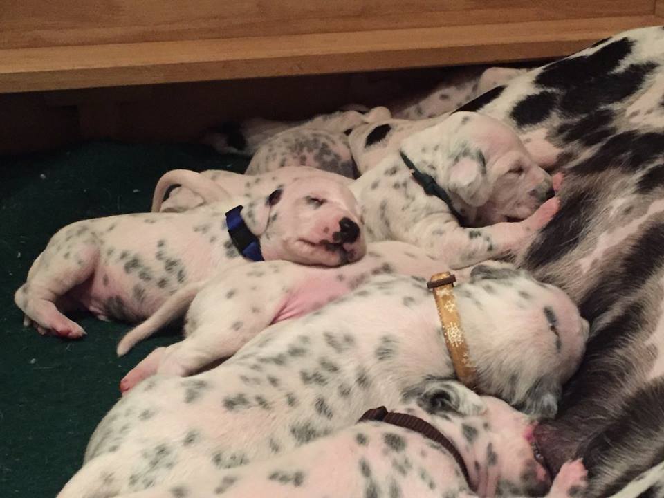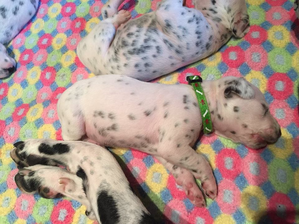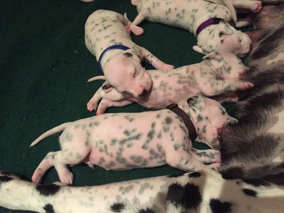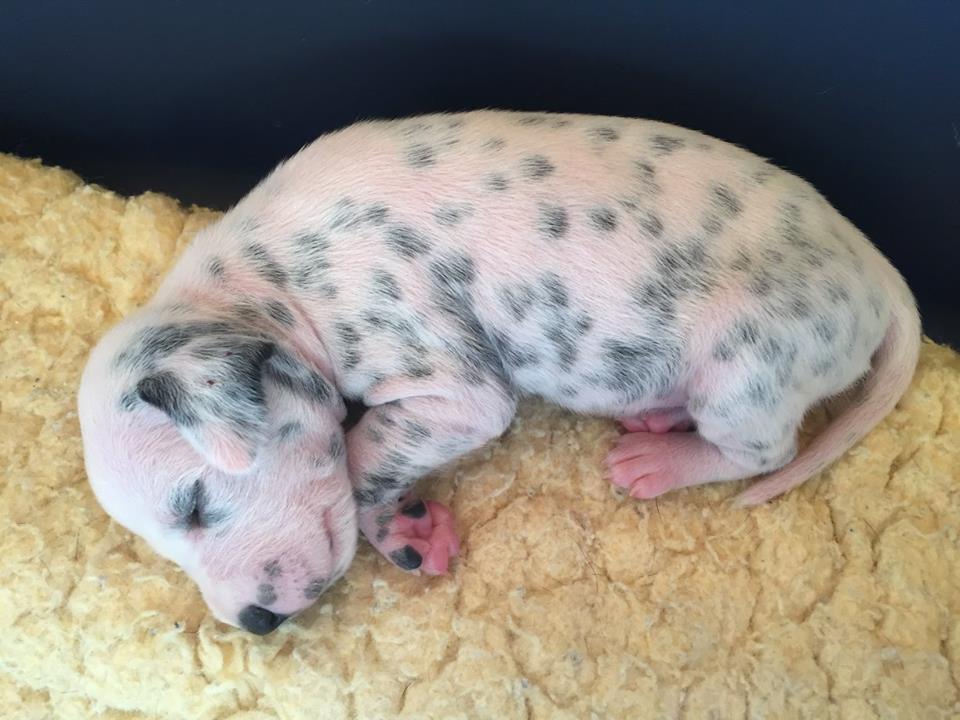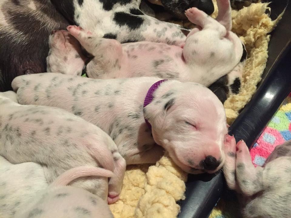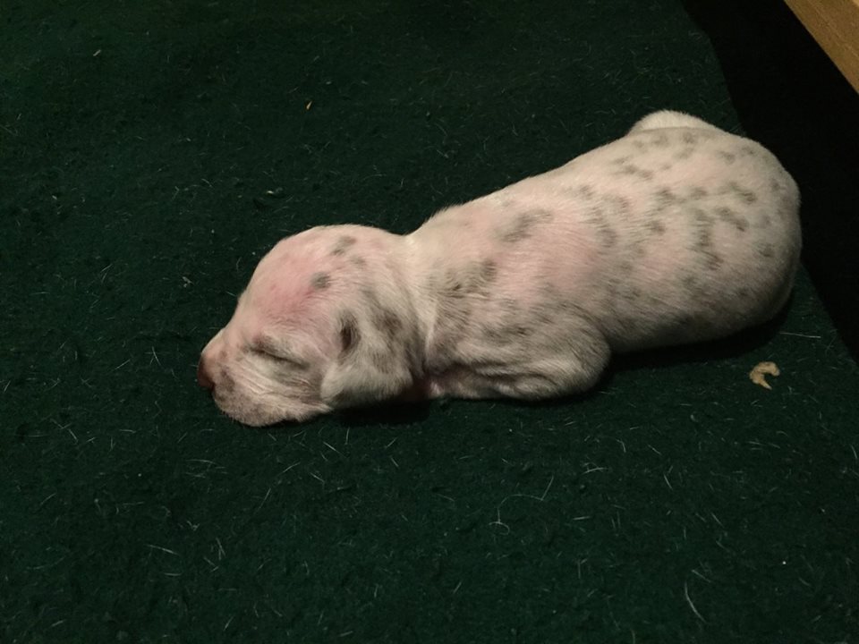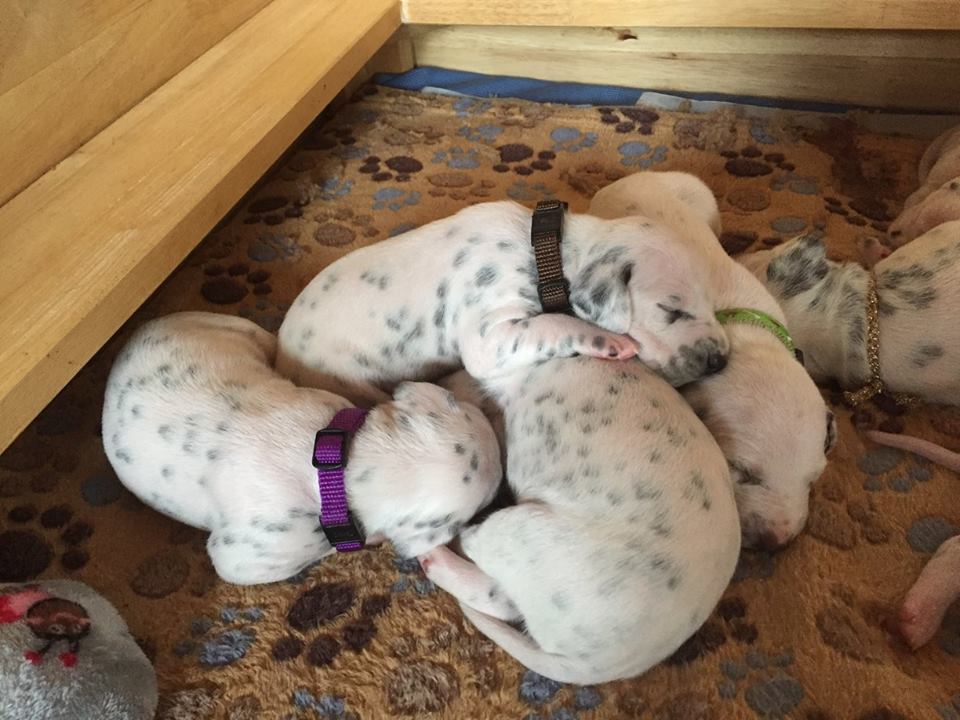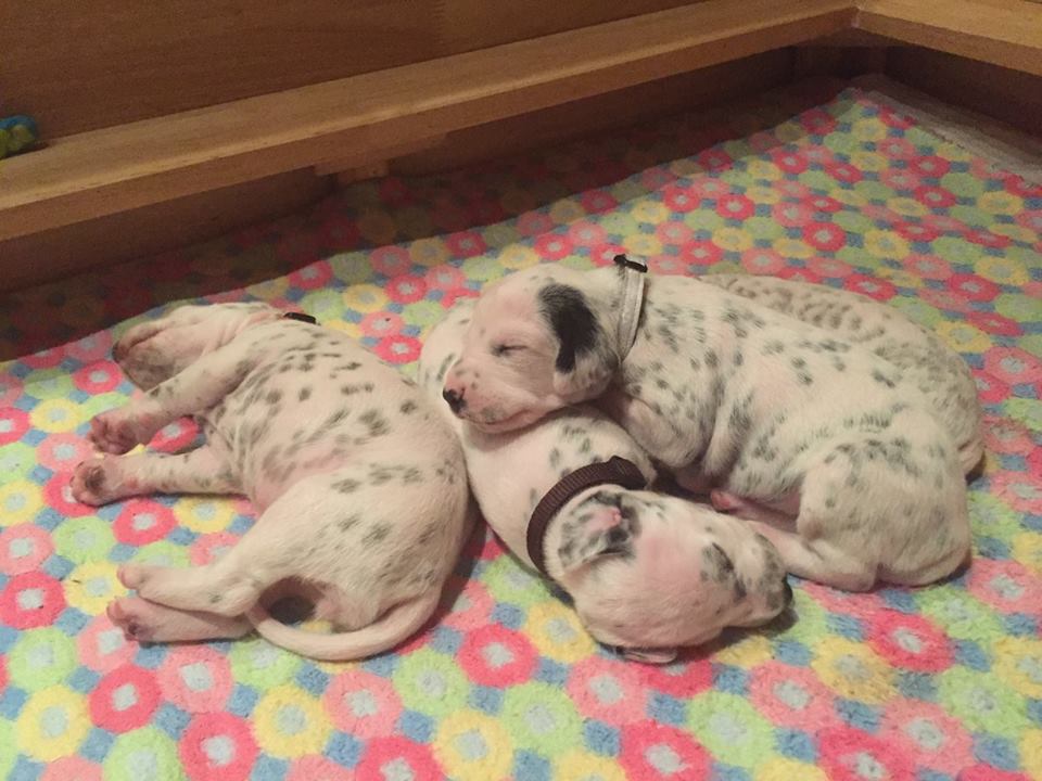 Anfang der zweiten Woche hatten alle ihr Geburtsgewicht verdoppelt. So langsam öffnen sich die Augen und auch die Farbe der Tupfen wird kräftiger. Die Kleinen beginnen nicht nur an Mamas Zitzen, sondern auch an ihren Geschwistern zu nuckeln 🙂 Die Halsbändchen haben wir auch ausgetauscht in etwas Größere.