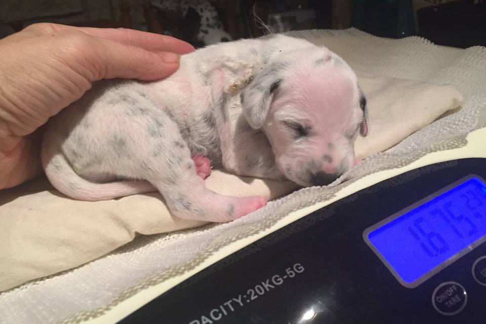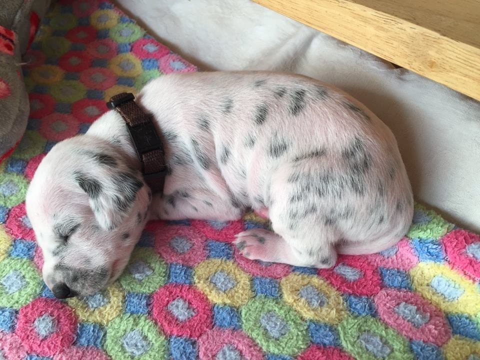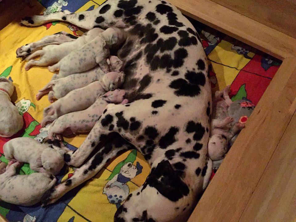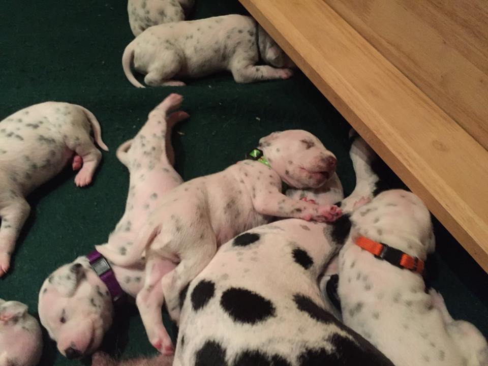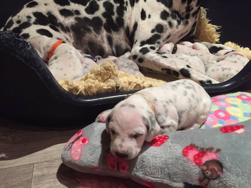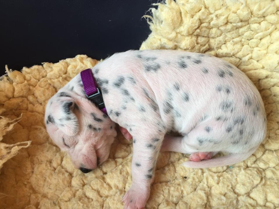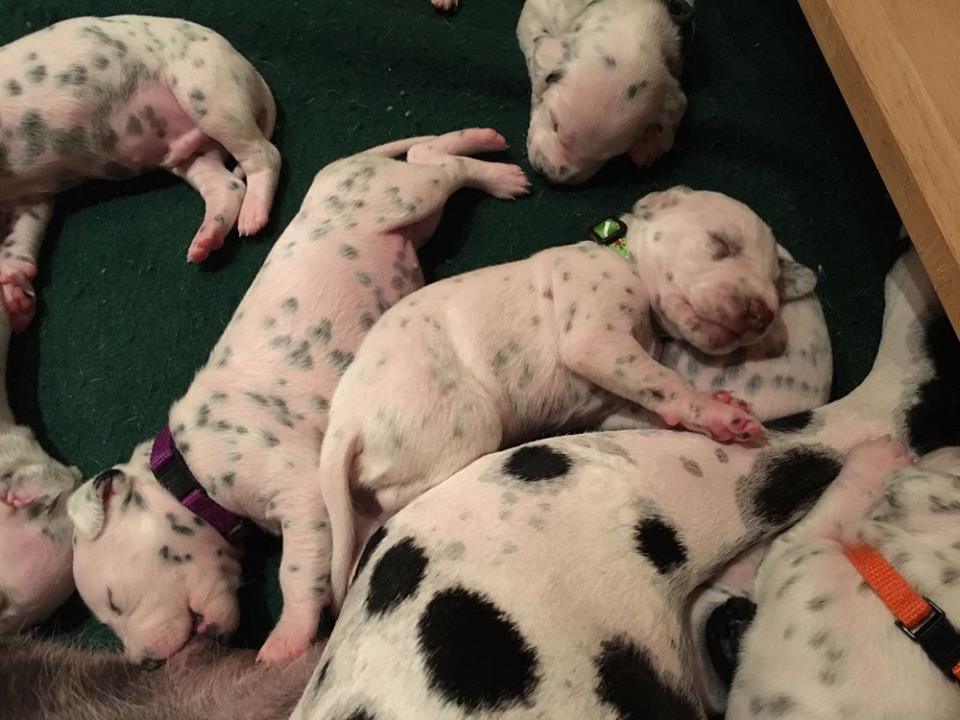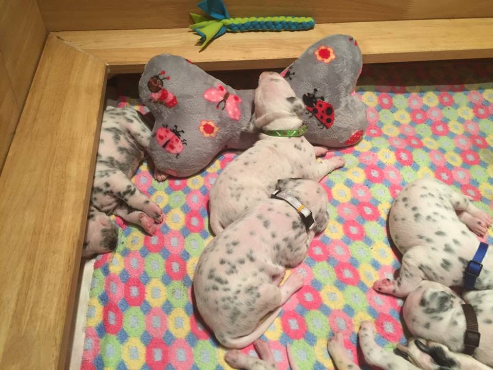 Anfang der zweiten Woche hatten alle ihr Geburtsgewicht verdoppelt. So langsam öffnen sich die Augen und auch die Farbe der Tupfen wird kräftiger. Die Kleinen beginnen nicht nur an Mamas Zitzen, sondern auch an ihren Geschwistern zu nuckeln 🙂 Die Halsbändchen haben wir auch ausgetauscht in etwas Größere.