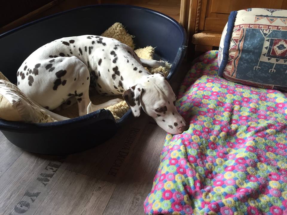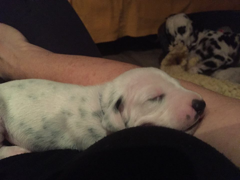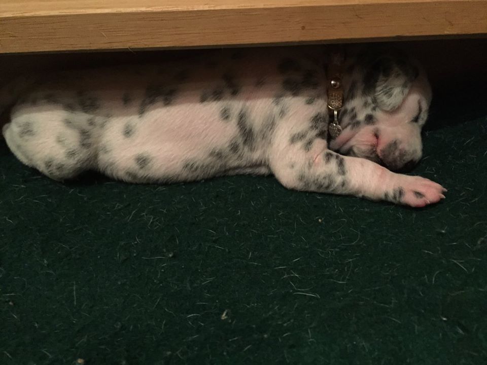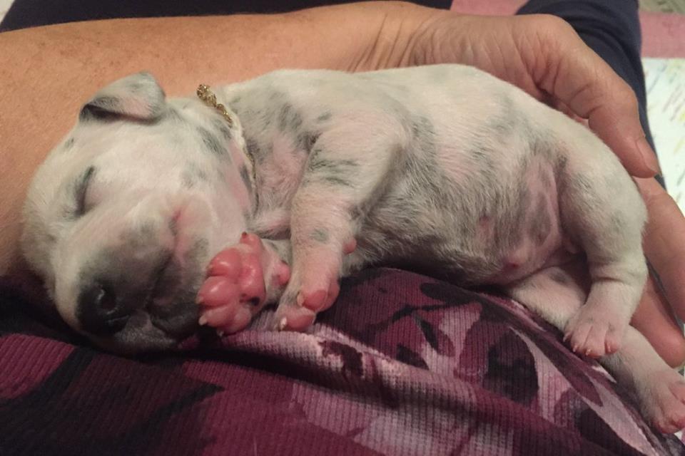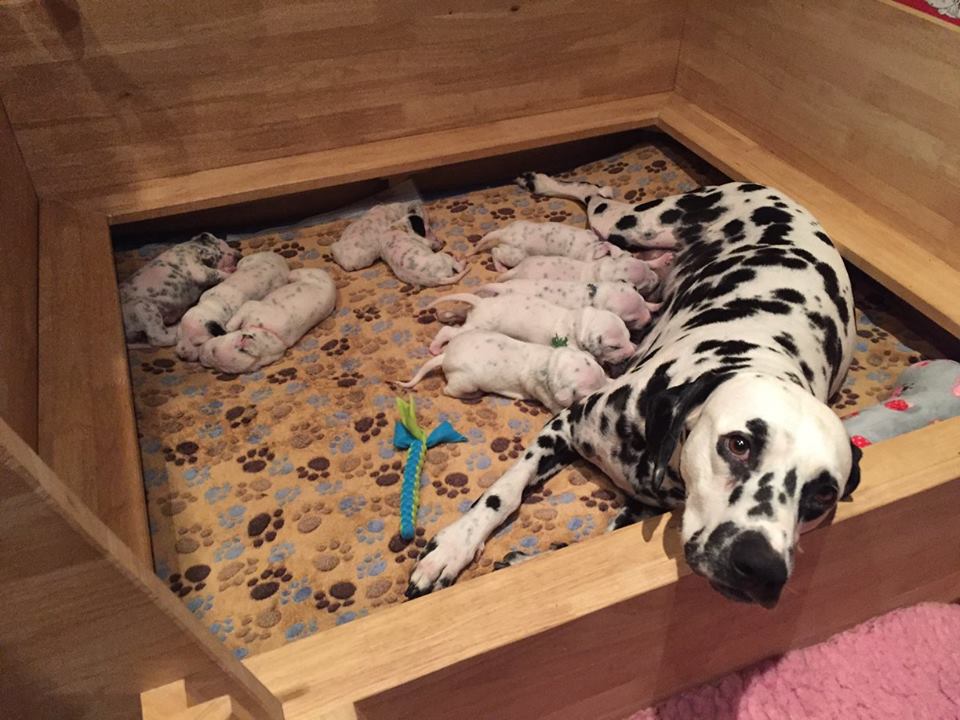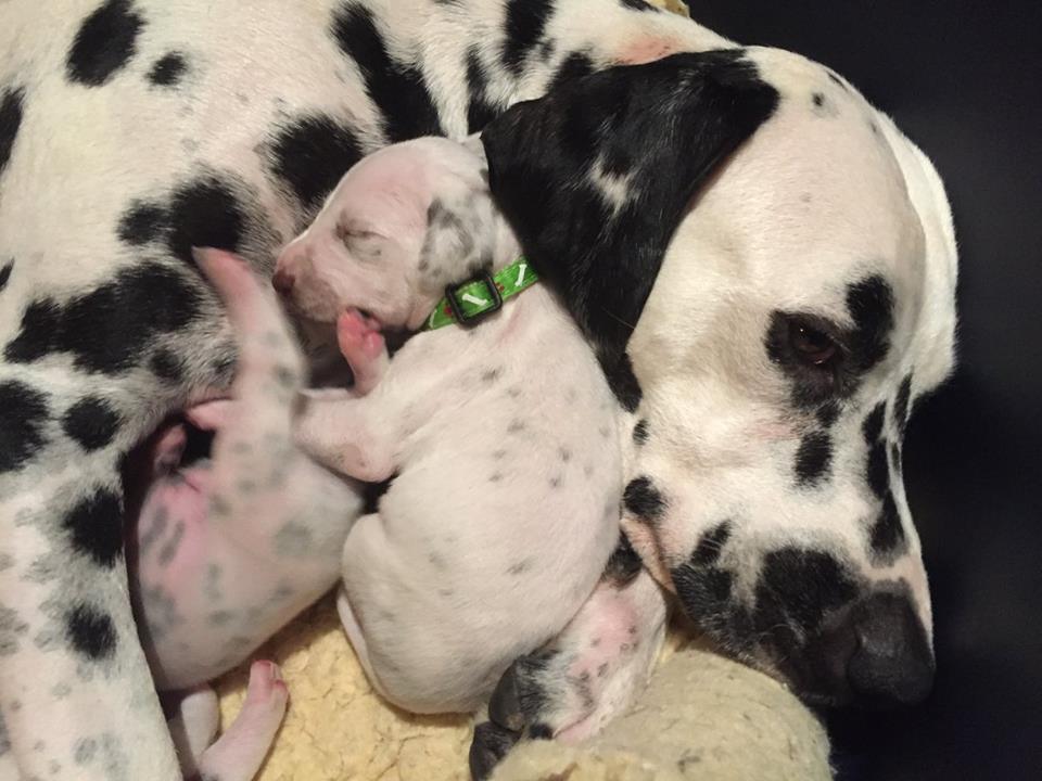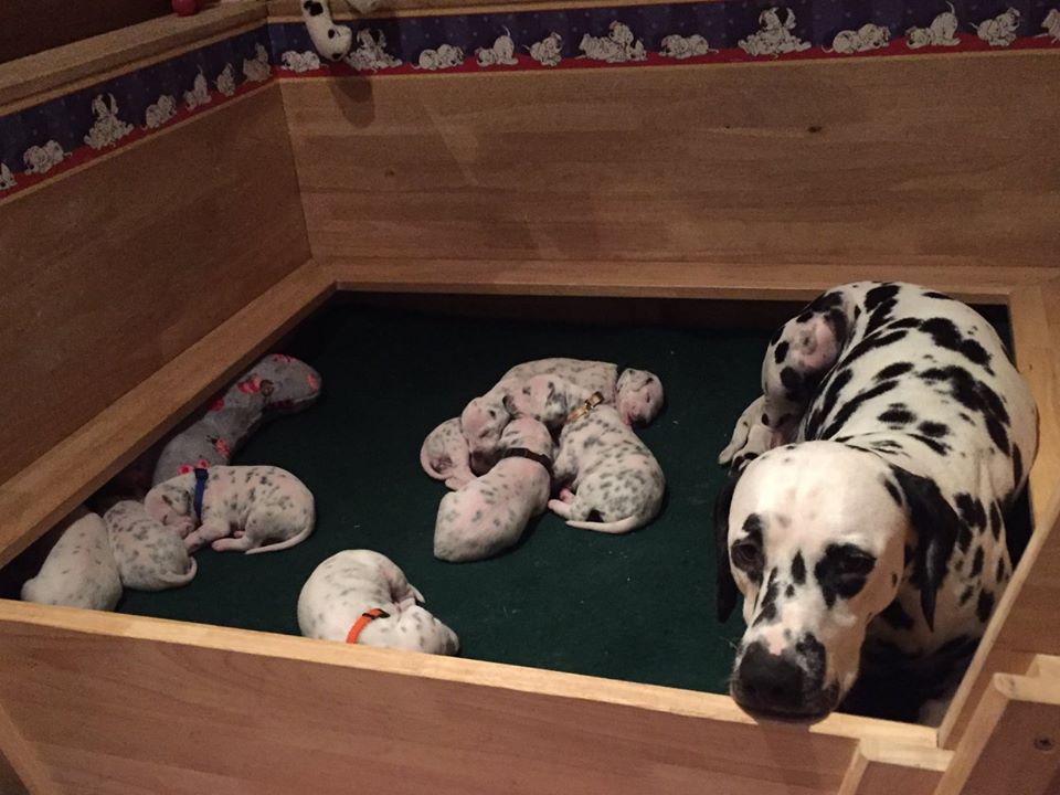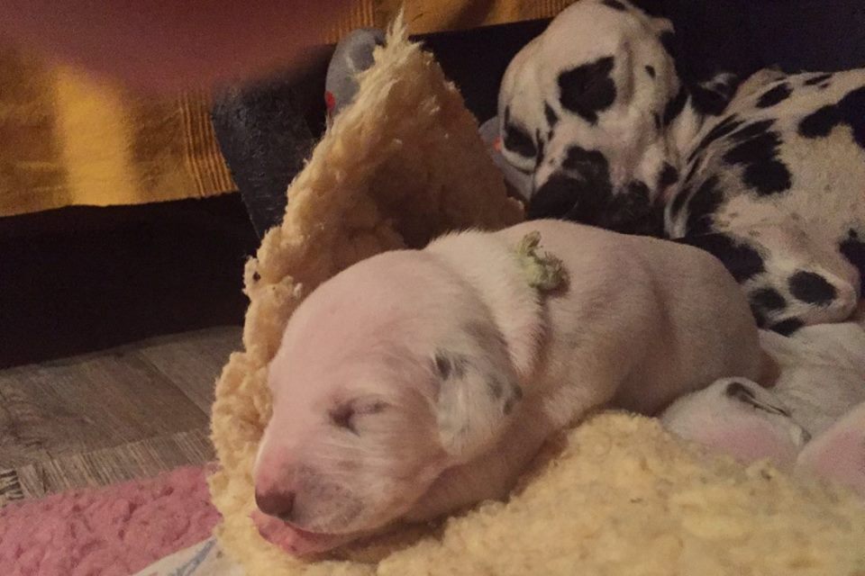 Anfang der zweiten Woche hatten alle ihr Geburtsgewicht verdoppelt. So langsam öffnen sich die Augen und auch die Farbe der Tupfen wird kräftiger. Die Kleinen beginnen nicht nur an Mamas Zitzen, sondern auch an ihren Geschwistern zu nuckeln 🙂 Die Halsbändchen haben wir auch ausgetauscht in etwas Größere.