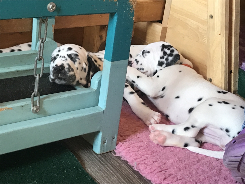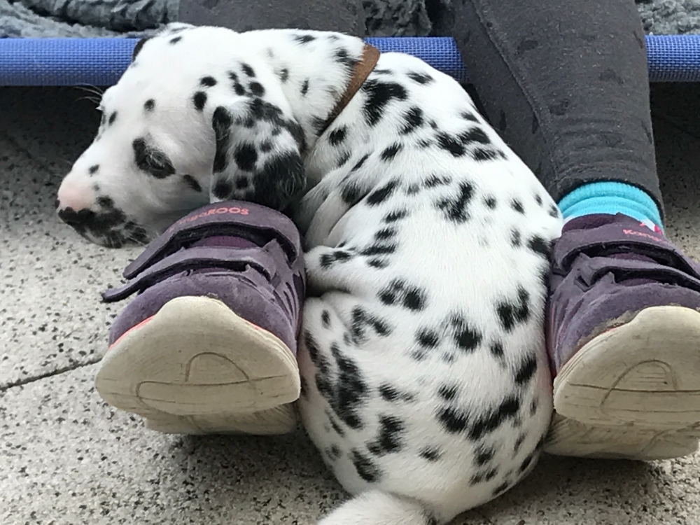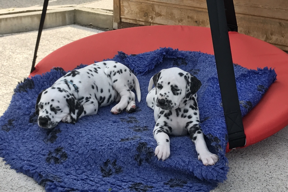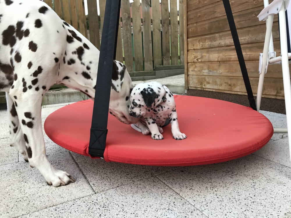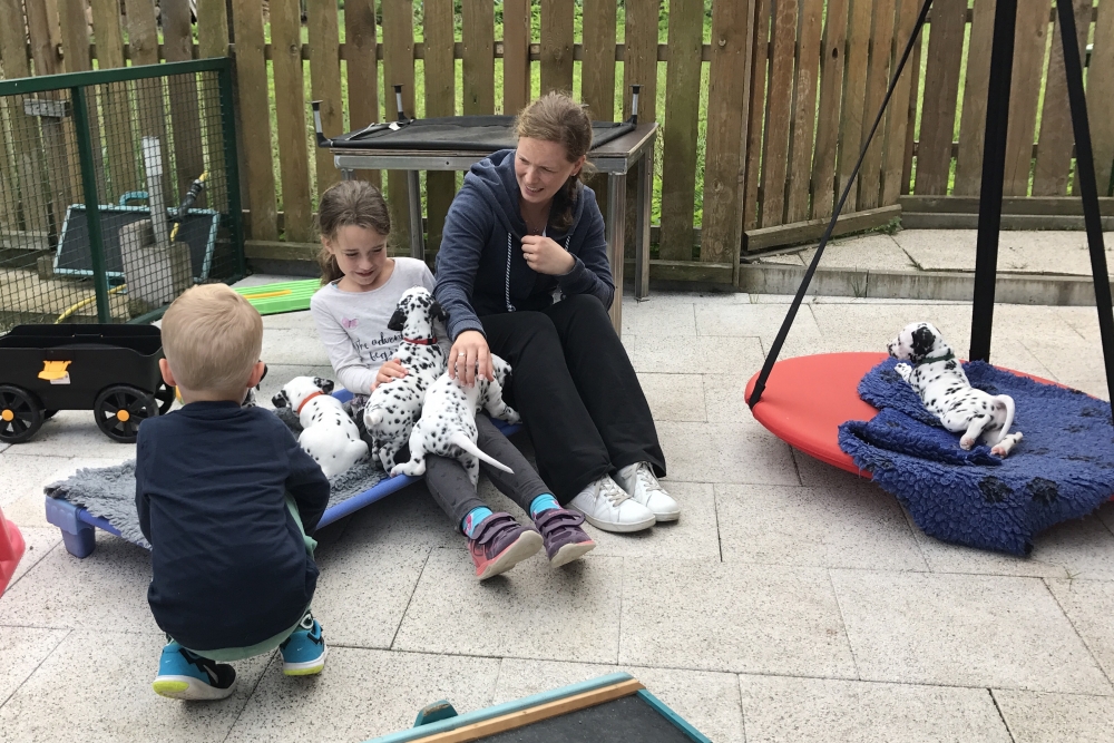 Sie erkunden bereits den Garten – erst das Häuschen, wo wir tagsüber sind, die Terrasse mit der Schaukel und dann den Garten mit der Sandkiste. Ist schon ein kleines Paradies. Und ganz plötzlich werden sie ruhiger, suchen sich schnell ein Plätzchen, sei es auf dem Weg nach oben oder auf der Liege und schlafen ganz fest, bis der erste wieder zum Spiel auffordert oder es Essen gibt.