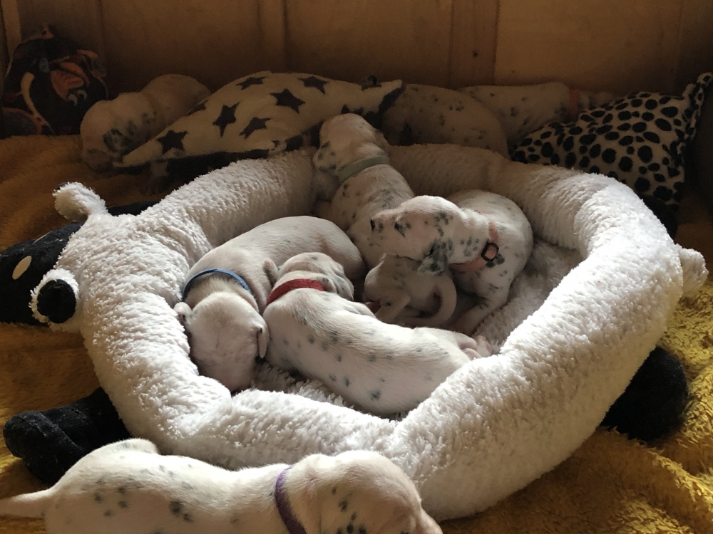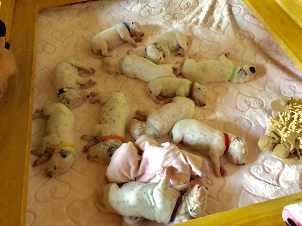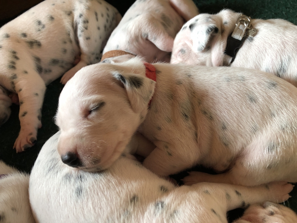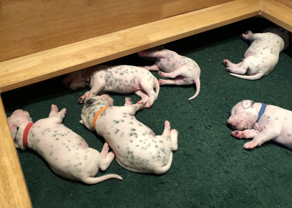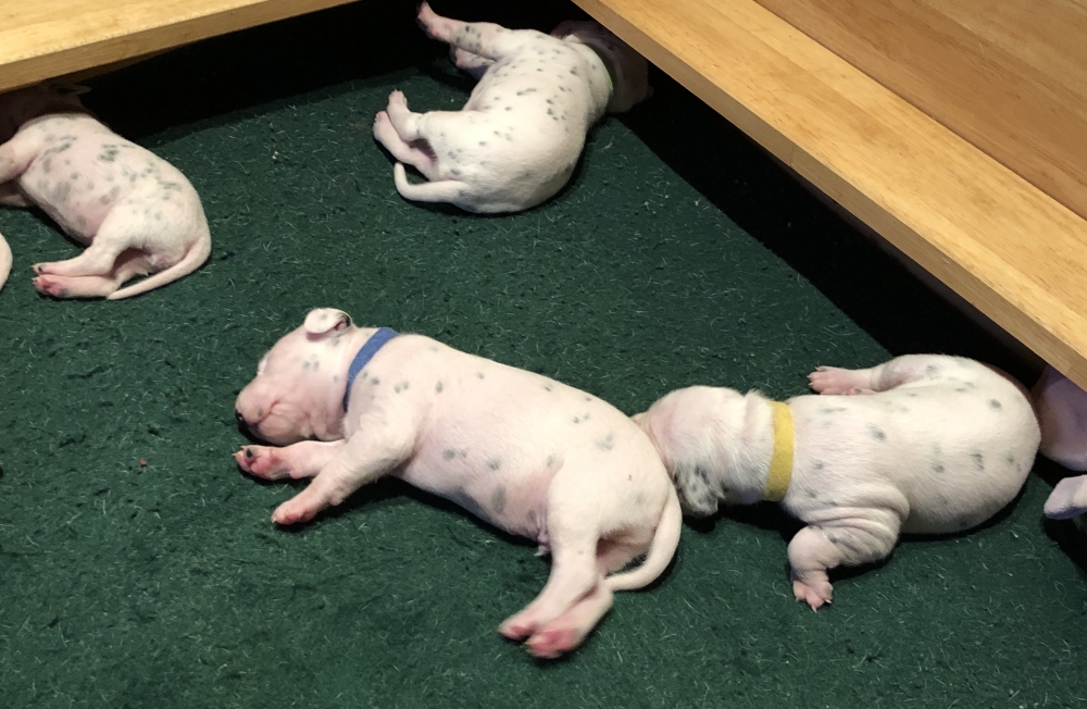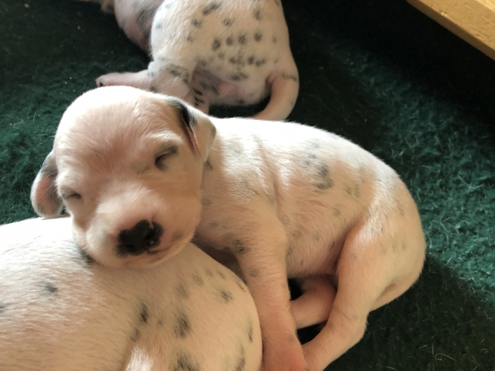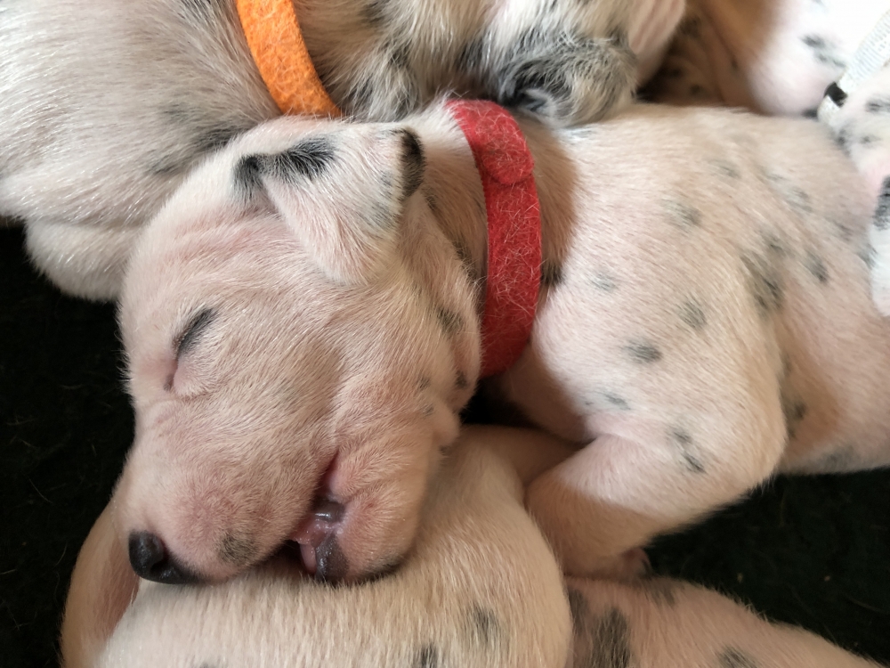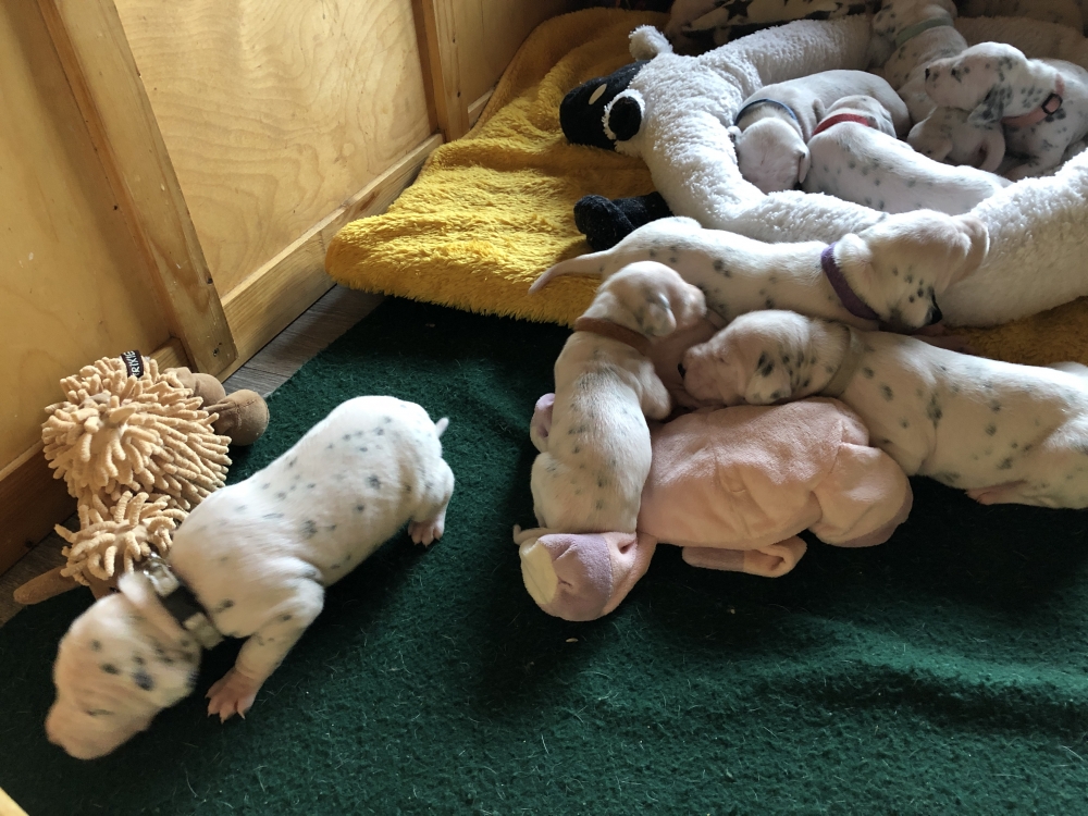 Auch wenn die Welpen die meiste Zeit noch geschlafen, kommt so langsam Bewegung rein. An der Milchbar bei Mia wird es auch schon eng, da die Zwerge ganz schön gewachsen sind.