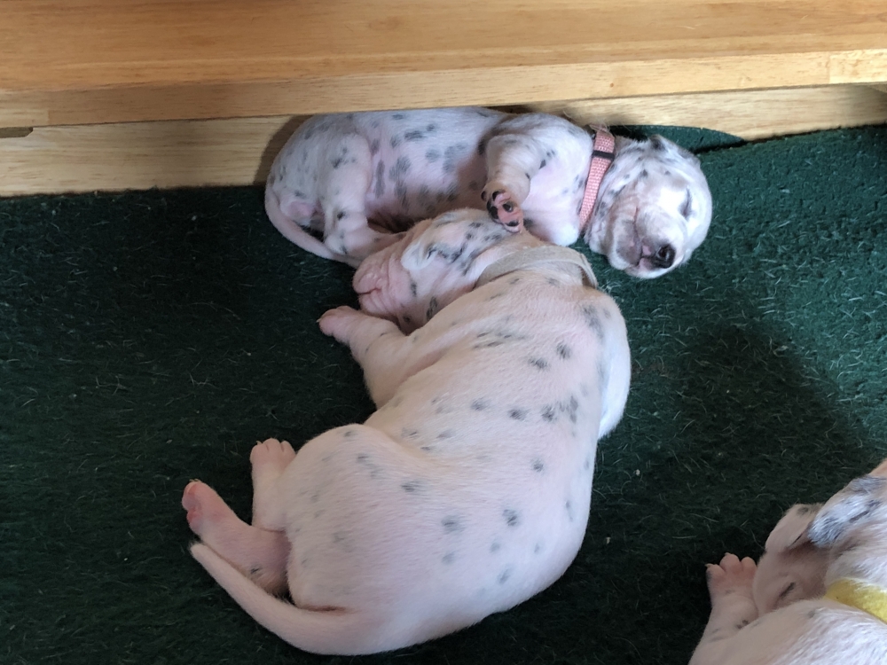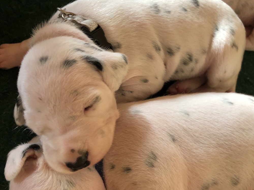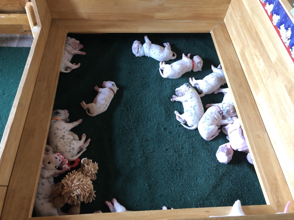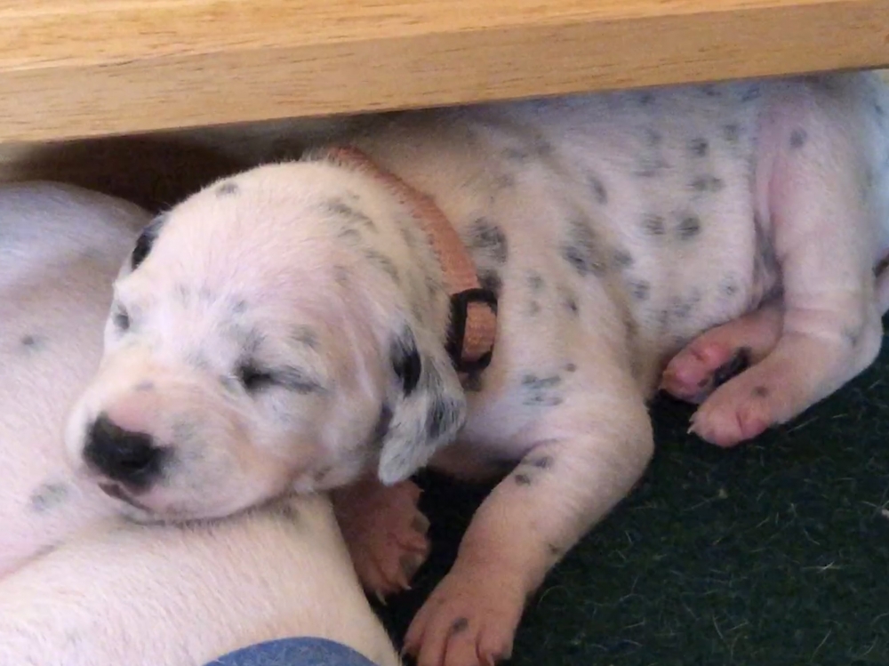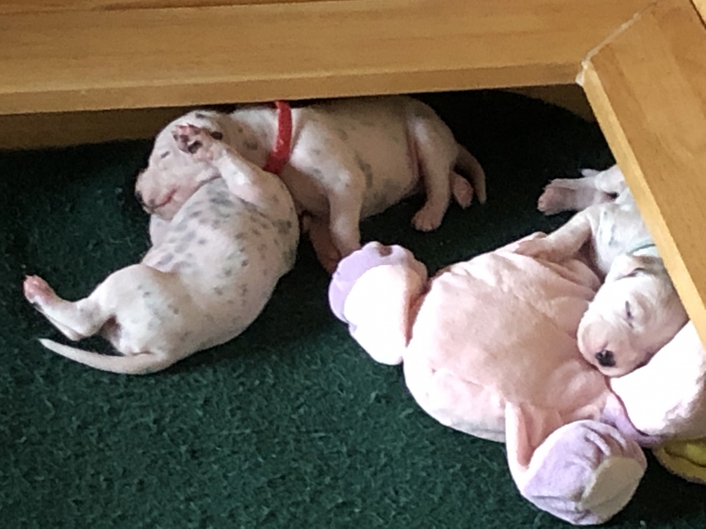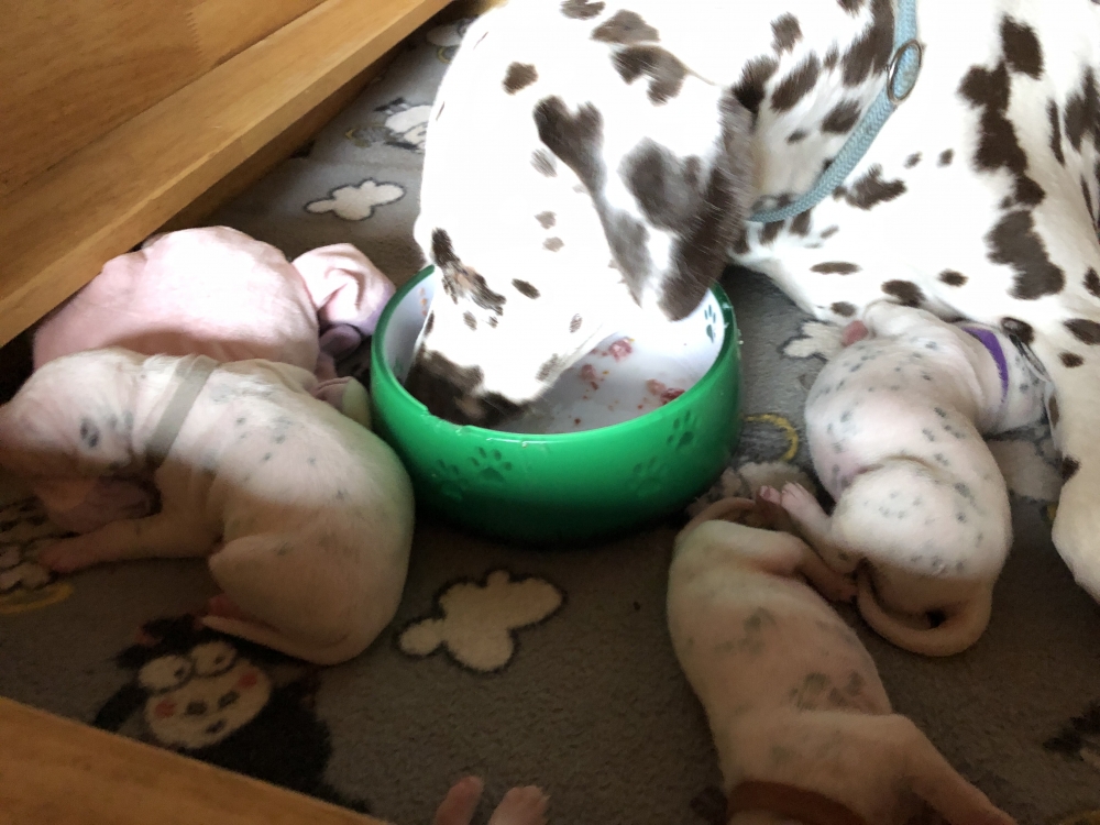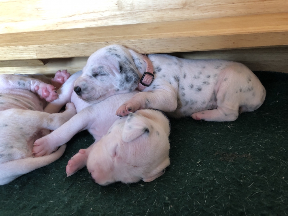 Auch wenn die Welpen die meiste Zeit noch geschlafen, kommt so langsam Bewegung rein. An der Milchbar bei Mia wird es auch schon eng, da die Zwerge ganz schön gewachsen sind.