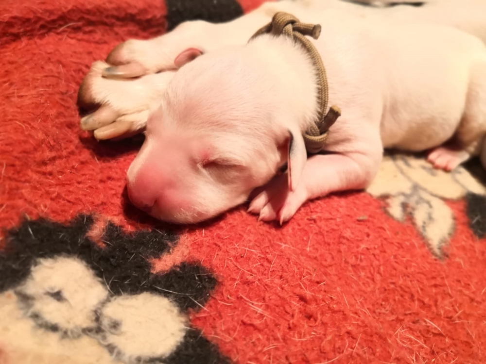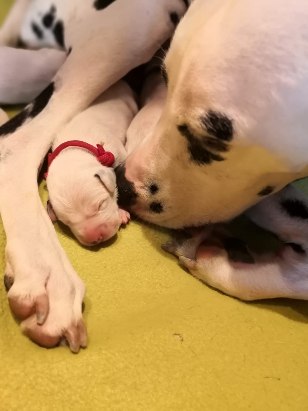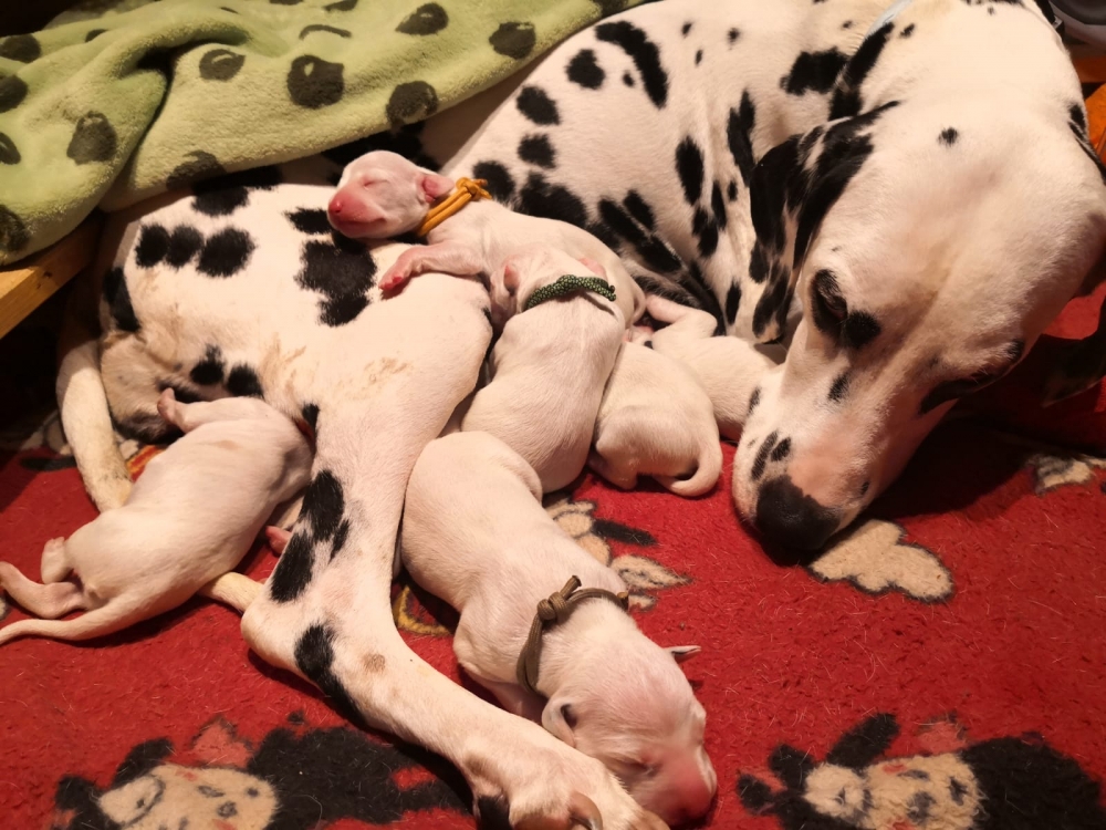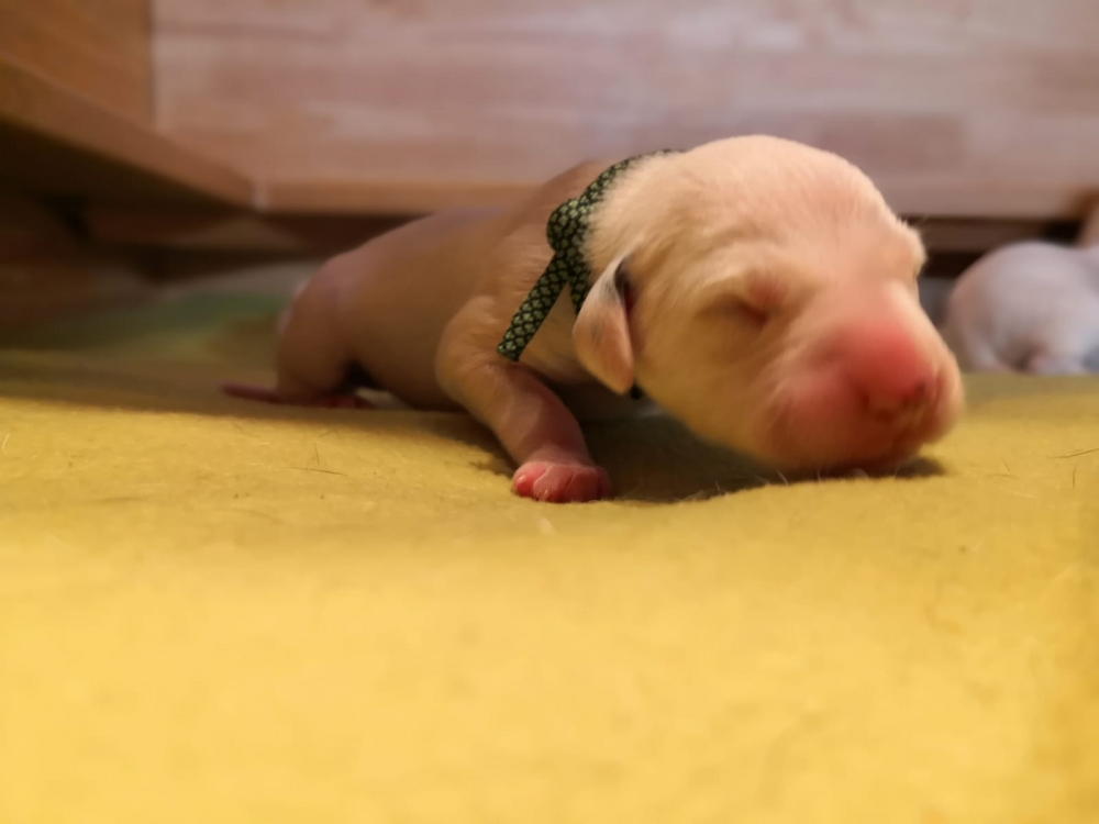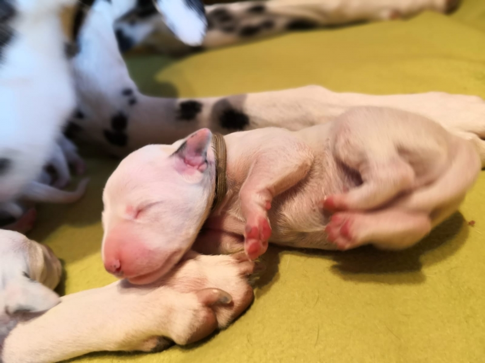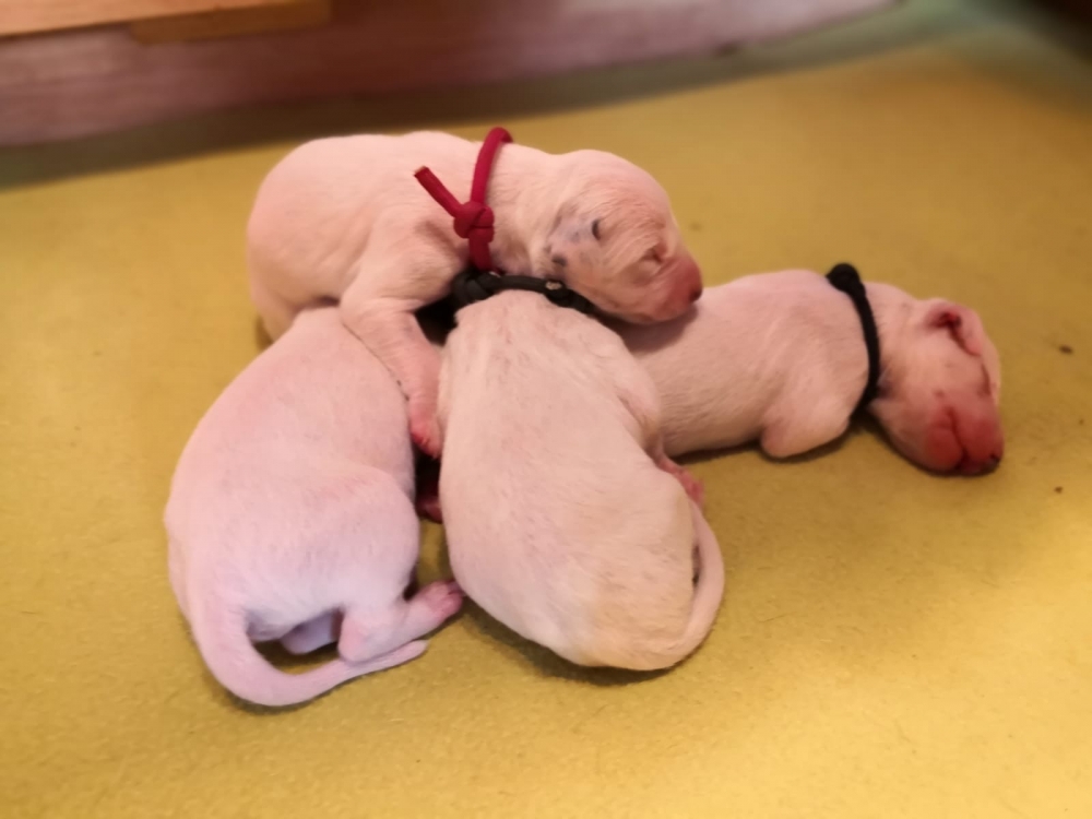 Mama Enna Lou ist den ganzen Tag und Nacht am säugen und putzen. Zwischendurch wird geschlafen. Noch sind die Äugeln und die Ohren noch ganz zu und auch die Fleckung ist nur zu erahnen. Jeden Abend wiegen wir die kleinen Zwerge, jeder wird liebevoll in die Hand genommen und gekuschelt. Alle nehmen super an Gewicht zu..