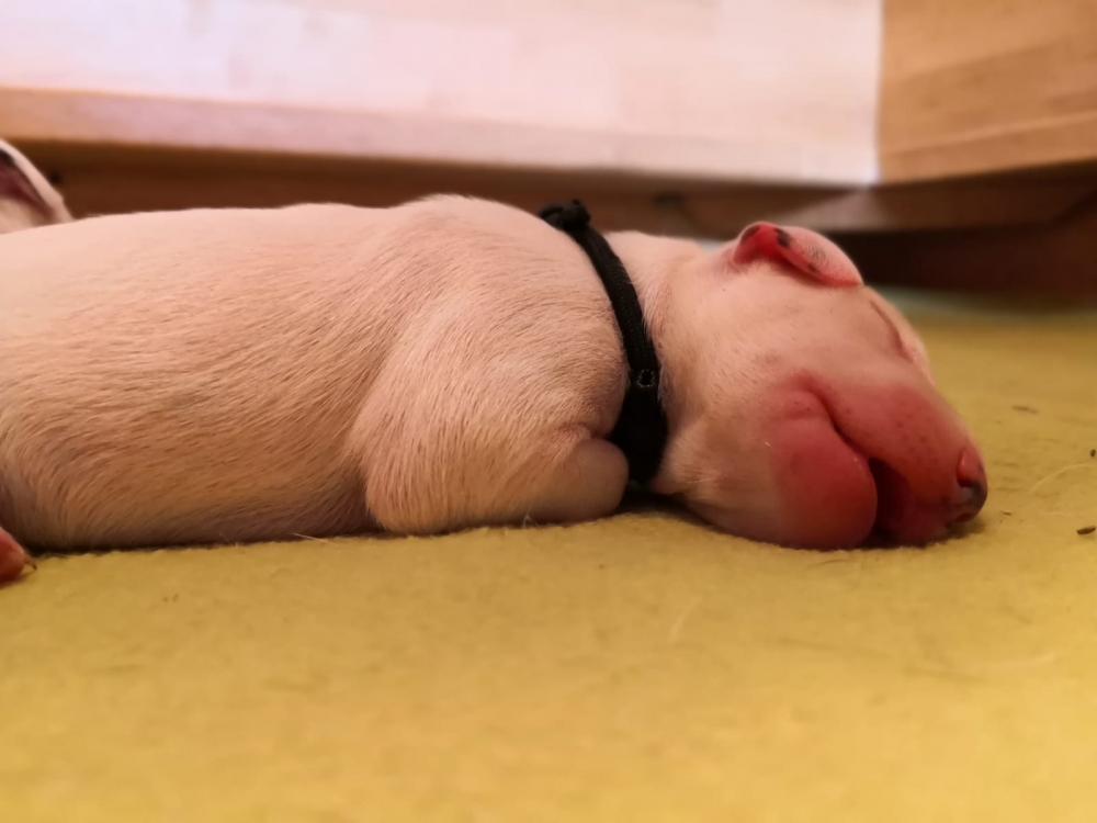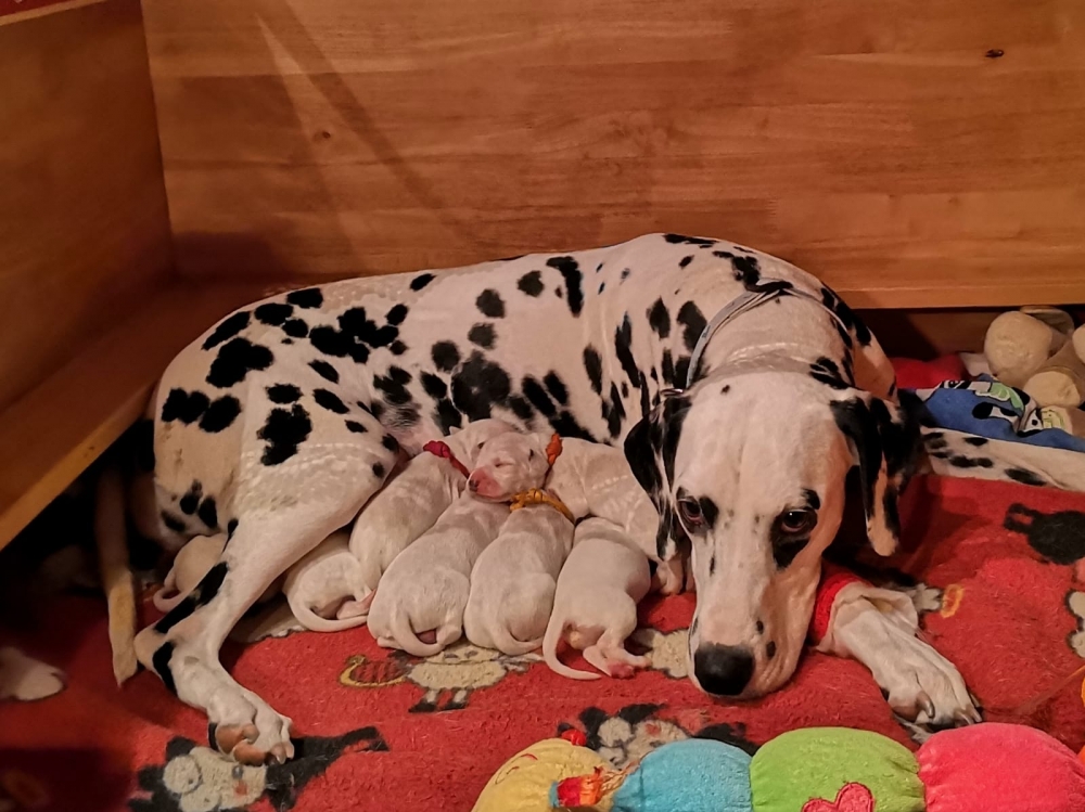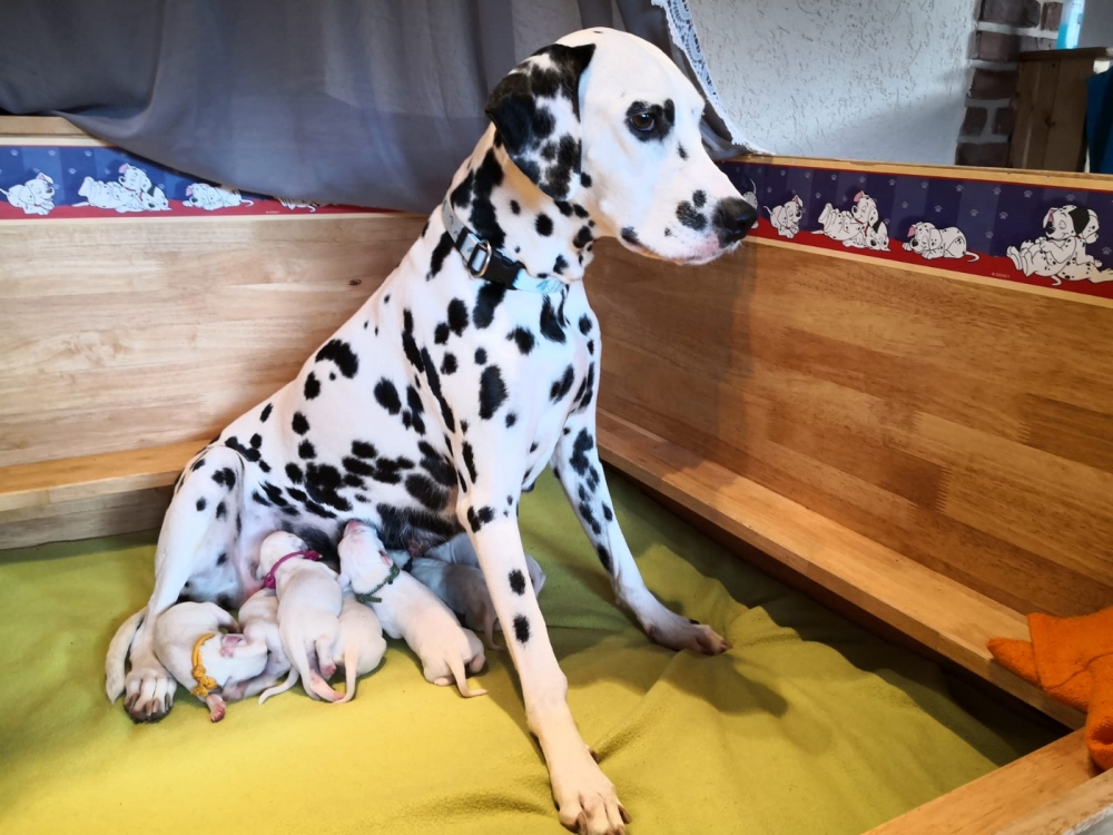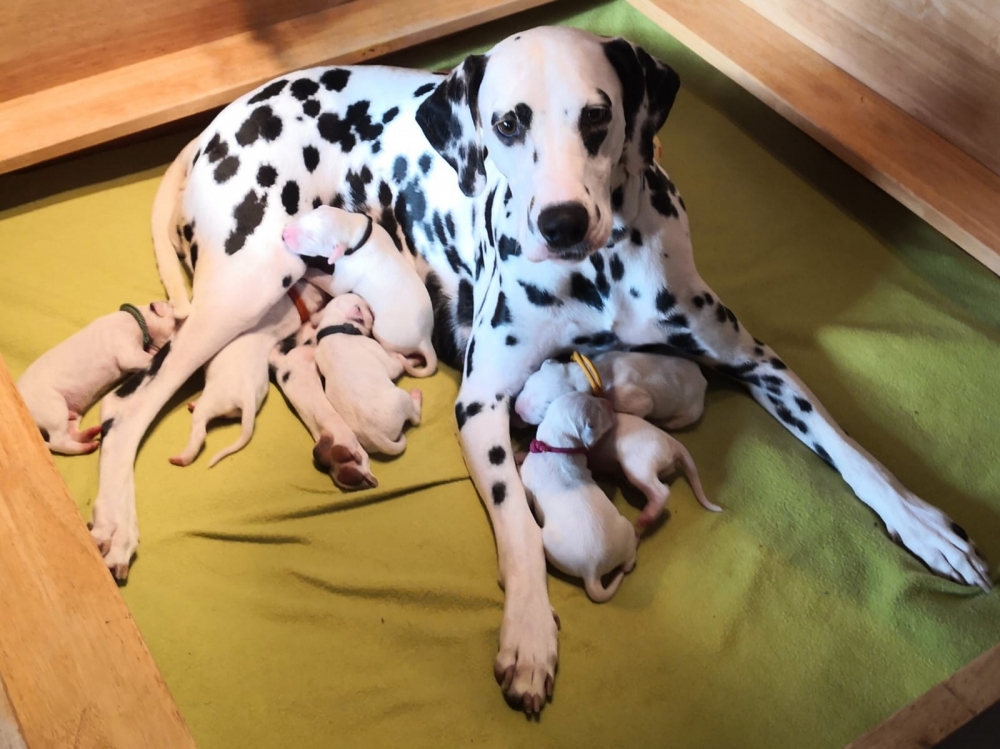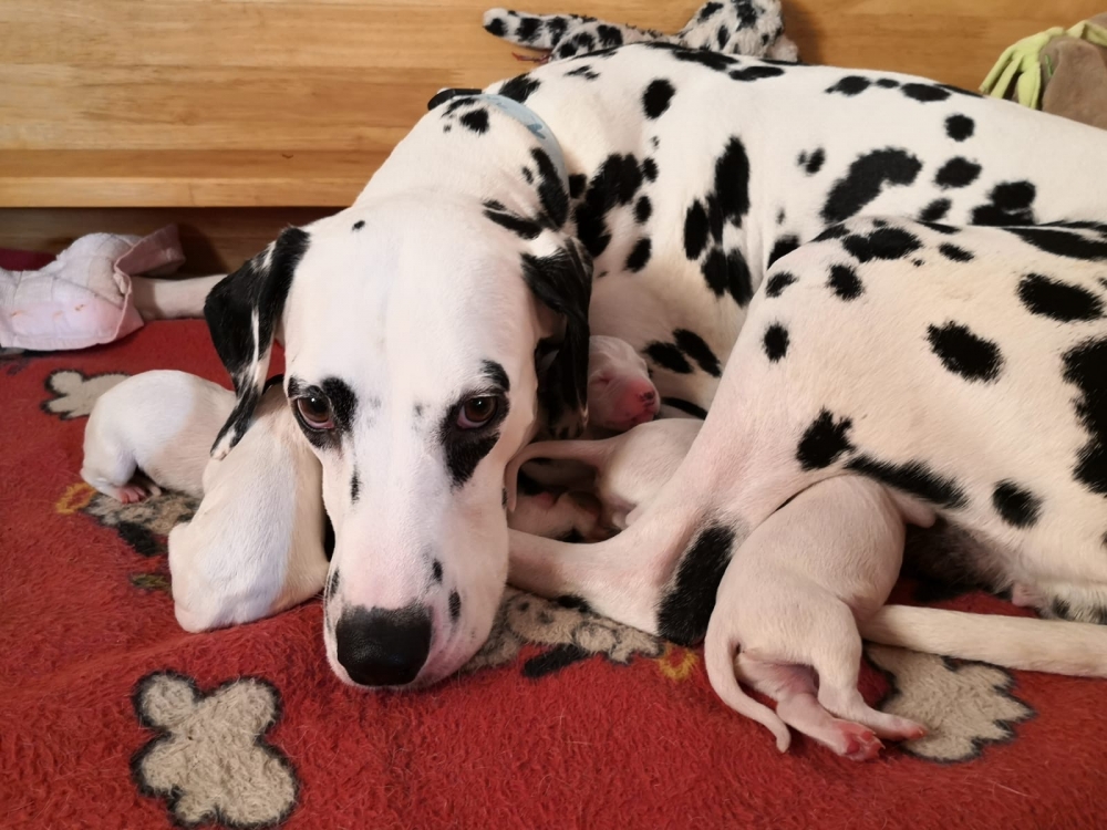 Mama Enna Lou ist den ganzen Tag und Nacht am säugen und putzen. Zwischendurch wird geschlafen. Noch sind die Äugeln und die Ohren noch ganz zu und auch die Fleckung ist nur zu erahnen. Jeden Abend wiegen wir die kleinen Zwerge, jeder wird liebevoll in die Hand genommen und gekuschelt. Alle nehmen super an Gewicht zu..