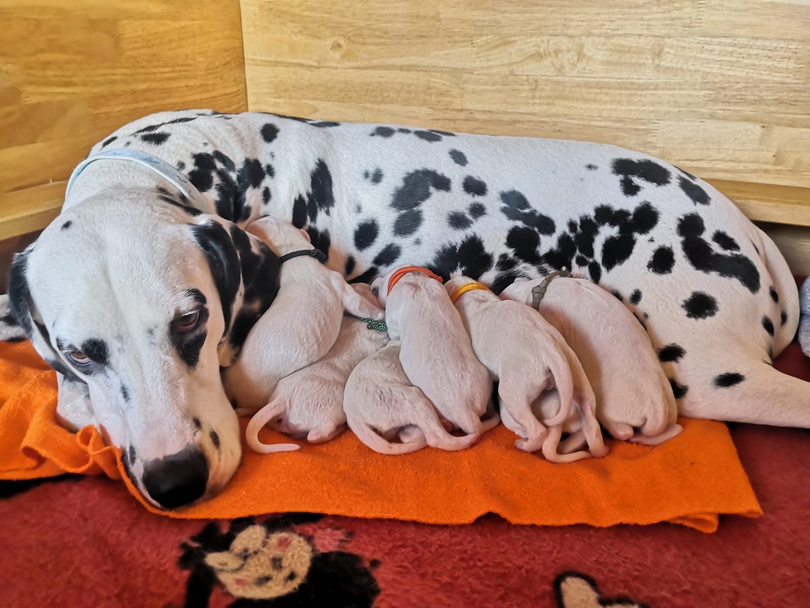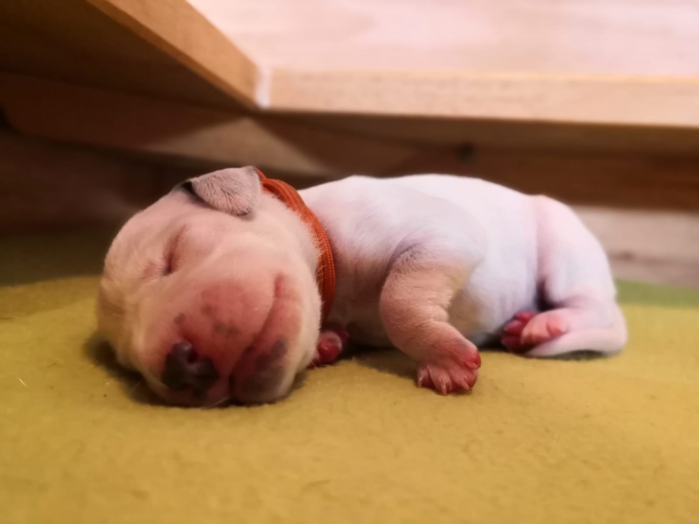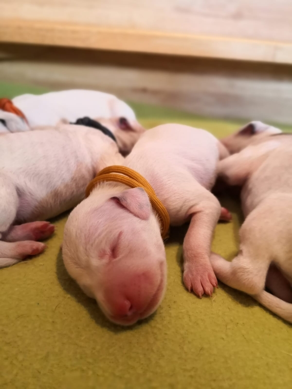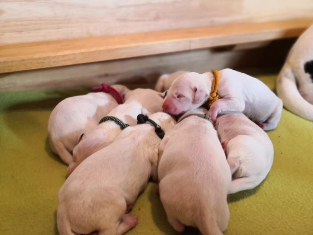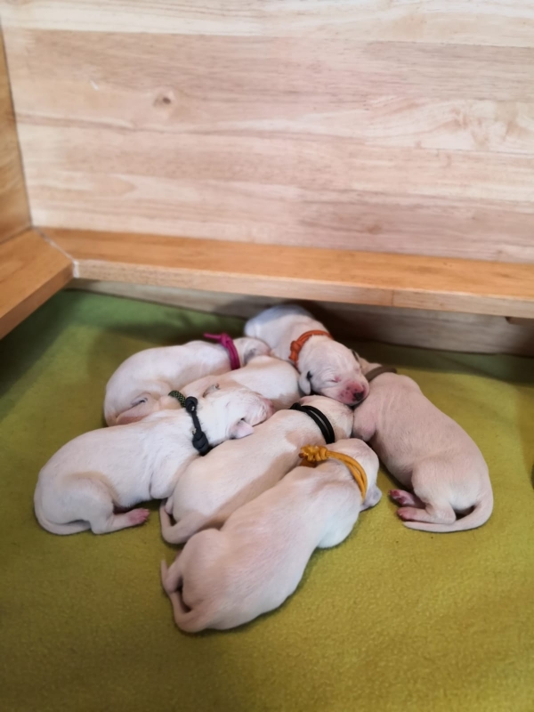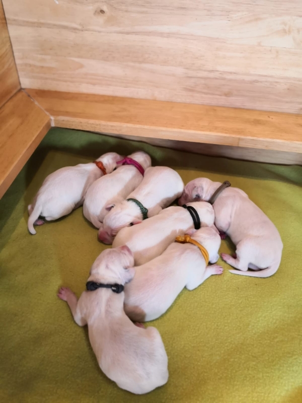 Wir haben jetzt 2 kleine Hündinnen und 5 kleine Rüden in der Wurfkiste liegen.