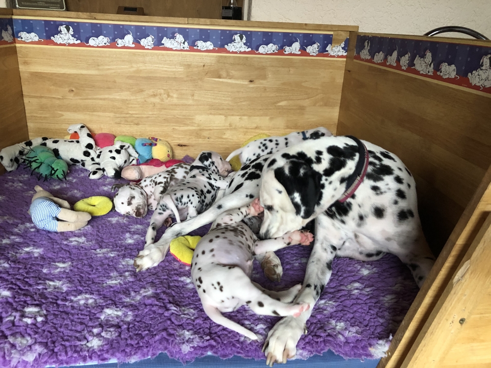 Jetzt beginnt die Zeit, wo Mama Betty auch mal 20 min Luft holt und außerhalb der Wurfkiste die Augen zu macht. Aber nicht lange, denn sobald sie ein Mucks hört, springt sie hoch und schaut nach dem Rechten